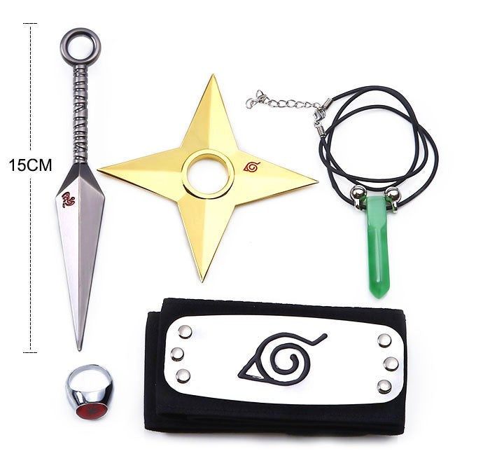 5-piece set of Naruto accessories. The items included are headband, necklace, ring, kunai and shuriken